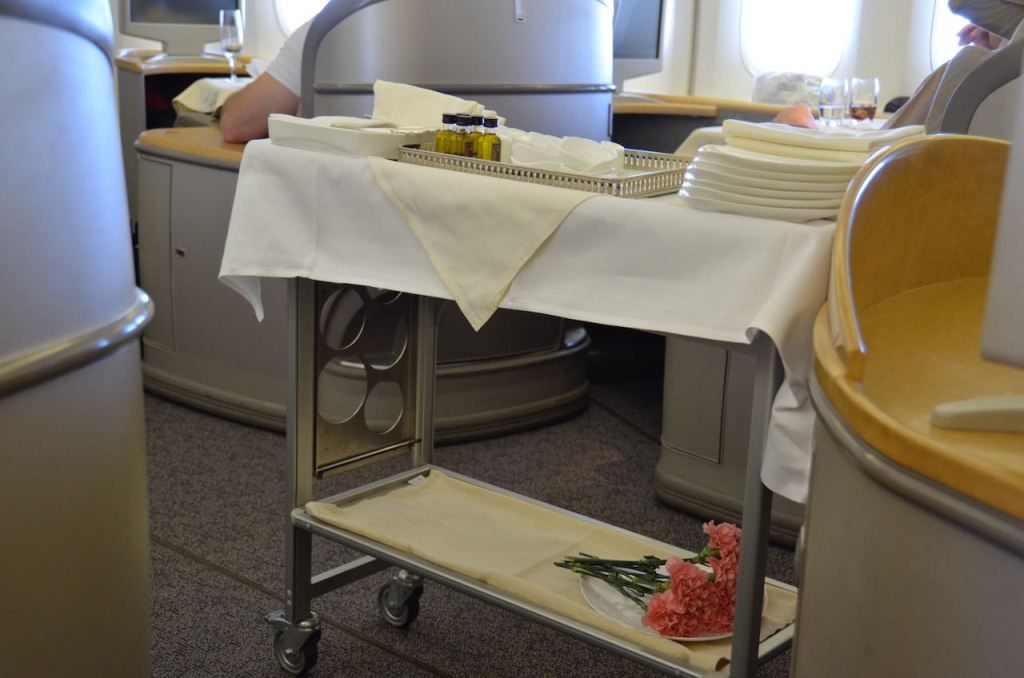 Once at a comfortable cruising altitude, the flight attendants used a cart to set the table.
