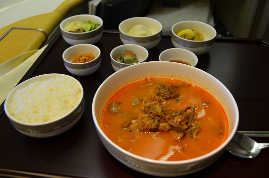 This time, I opted for the Korean Service – Yukjaeyang, a spicy beef soup with many side dishes. It was prepared in advance in the galley and served on a large tray at my table with the side dishes perfectly prepared in advance.