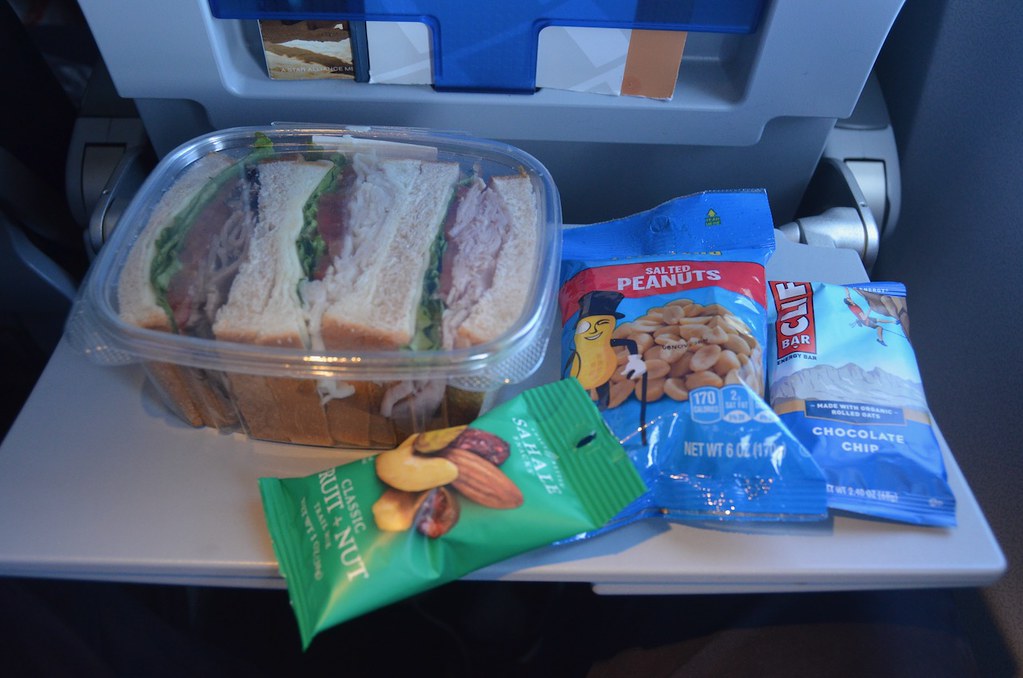 If you’re starting in Honolulu, this likely means buying a big bottle of Ethos Water at Starbucks because I didn’t find much on the secure side that was open at 5:30 AM. I didn’t allow myself enough time to go exploring to other parts of the terminal. In my case, I purchased the largest sandwich I could find at the nearby ABC Store and kept it fresh in the hotel room fridge at the Sheraton Waikiki.