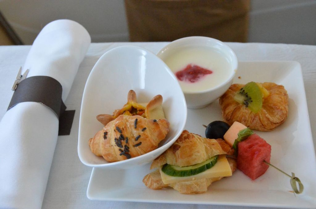 For such a short flight, we were also offered a breakfast menu consisting of baked goods, yogurt with jam, small pain au chocolat and other pasty items. We enjoyed this with a glass of champagne. This was a stark contrast from our other United meal earlier in the trip on a flight of similar duration.