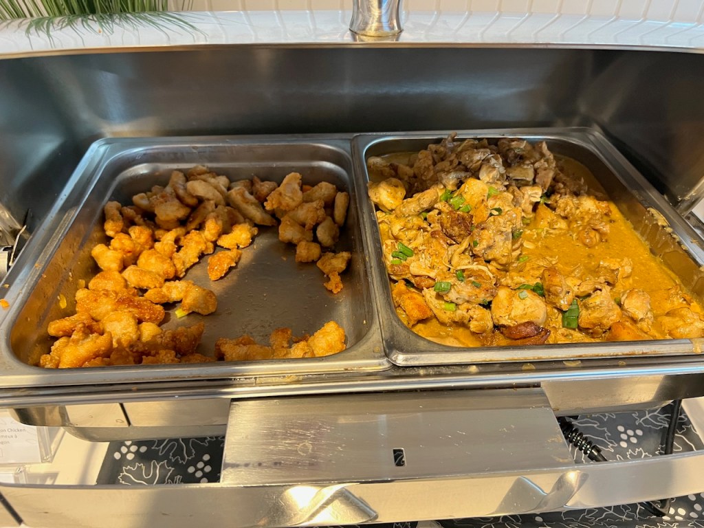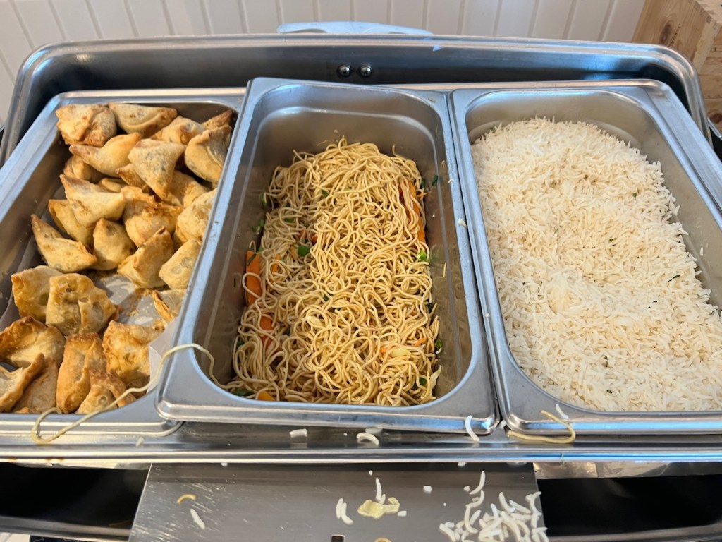 At other times of the day, there is a more substantial hot offering. This usually consists of rice, pasta and a protein. This is always served buffet style, and isn’t always the easiest to eat without cutlery.