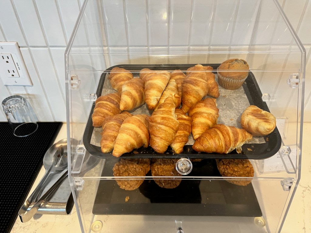 During breakfast hours, there are the usual scrambled eggs and link sausages that were put out. There were accompanied by croissants and other baked goods such. as marble rye bread and multi grain bread.