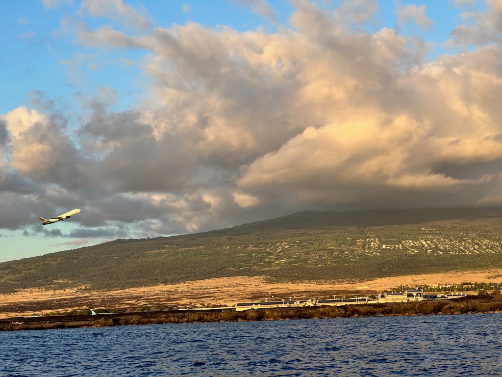 Our trip to Makako Bay by boat had us hugging the Kona coastline on the western side of the island as we navigated north. Our cruise took us along the shoreline with fabulous aviation views. The Kona International Airport had places taking off on a regular basis, and we viewed UPS Wide bodies take off over top of the runways with a backdrop of Hawaiian mountains.