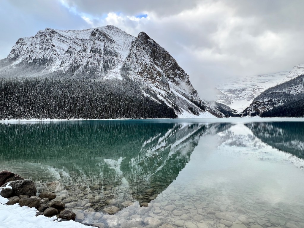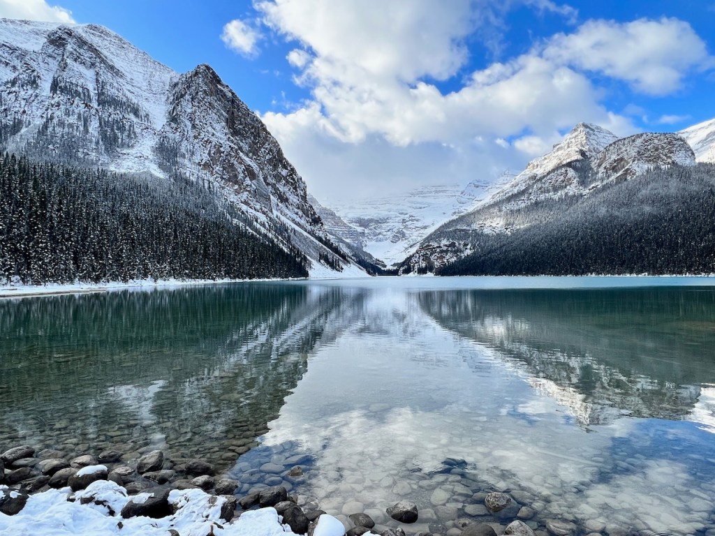 Lake Louise was looking a little clearer compared to yesterday. We would get to experience Lake Louise in picturesque simple beauty, set across a light winter backdrop.