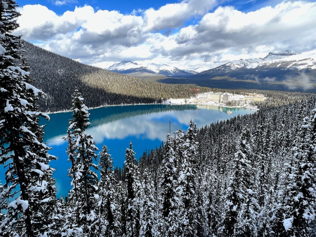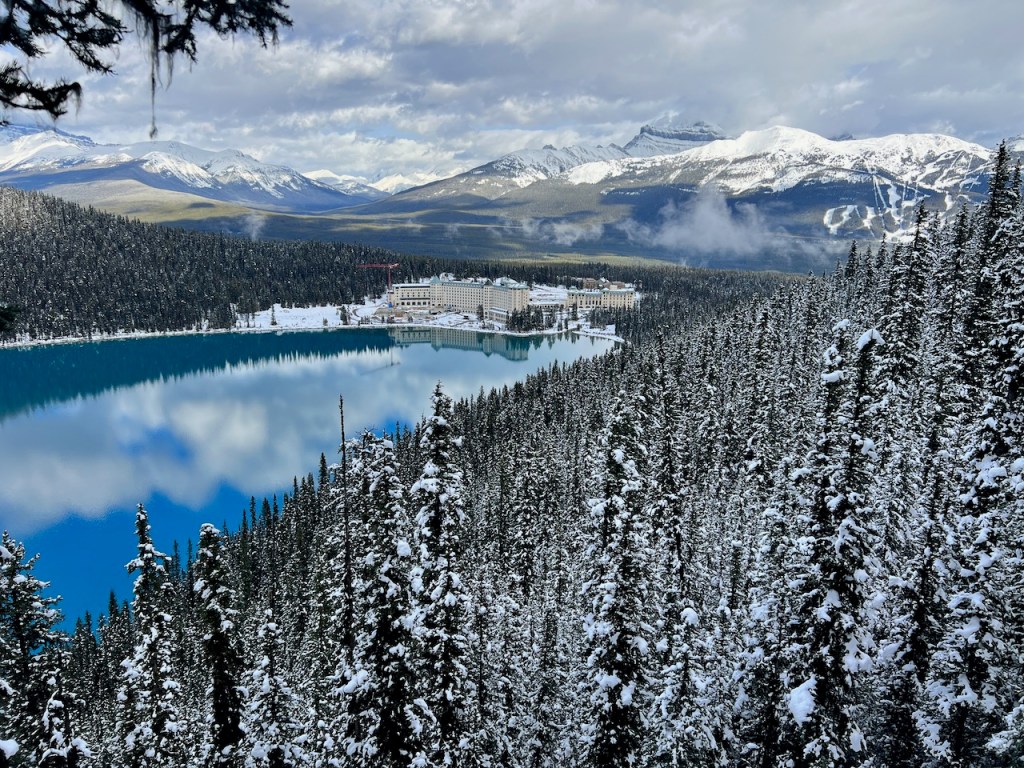 The Fairmont Château Lake Louise looked absolutely stunning in the valley, with the Lake Louise ski area located behind it, covered in a dusting of early winter snow.