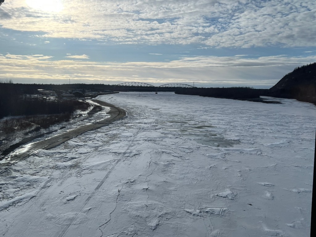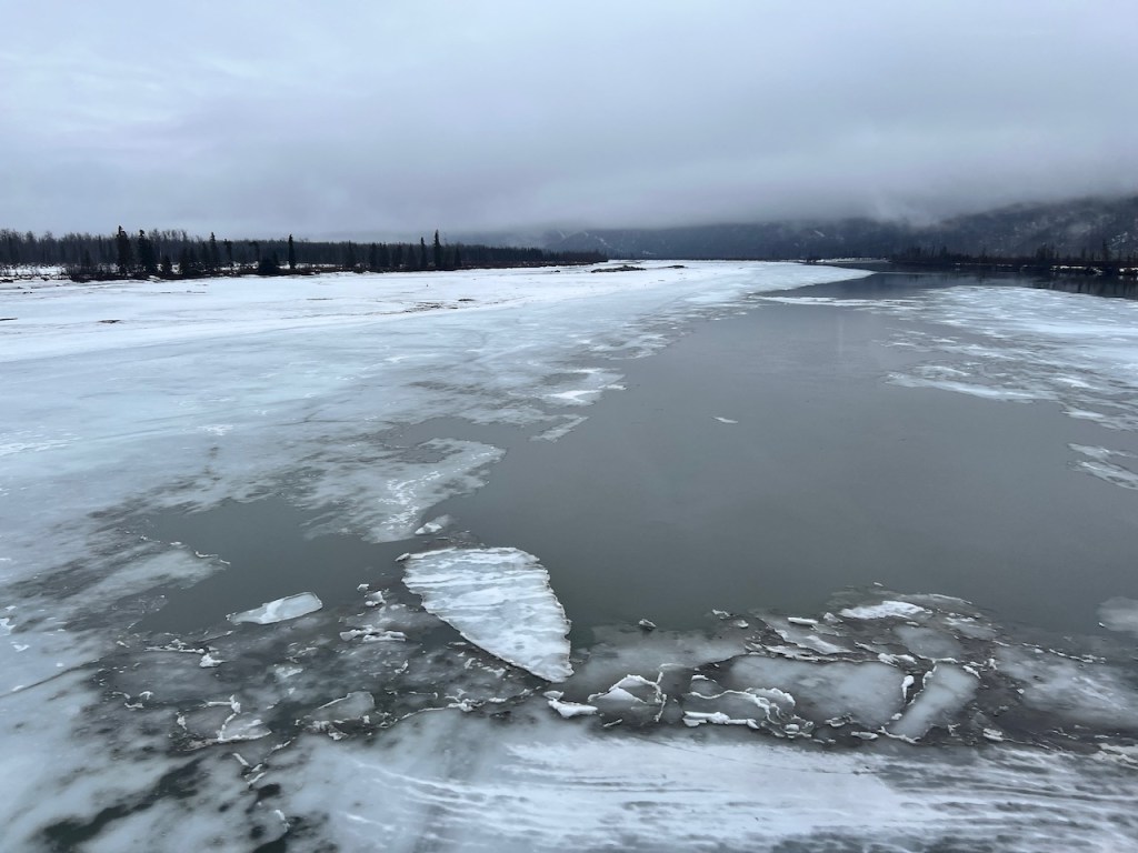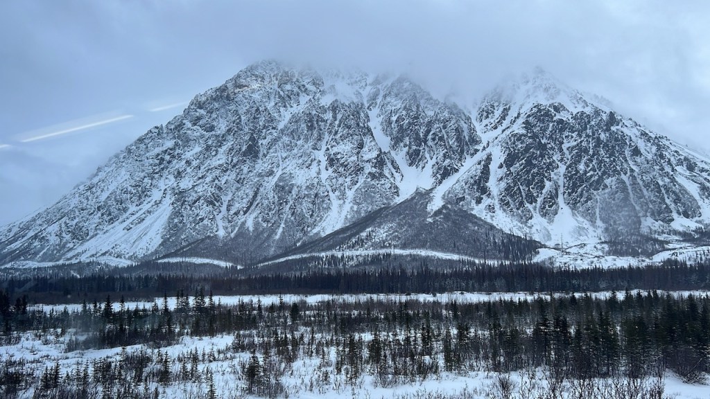 After departing Anchorage train station, the train wandered up through flat valleys surrounding Anchorage. Our views consisted of half frozen creeks in partial melt, for about the next hour and twenty minutes before reaching Wasilla.