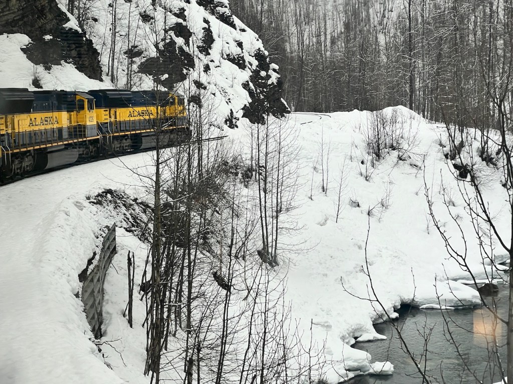 It was at this point that the scenery on the train started to get much more interesting. Instead of the long white plains of Anchorage, we entered into more of a twisting canyon as the trans serpentined it’s way as it made it’s way north. The views of the train and the Alaskan winter were what I imagined when riding the train in Alaska.