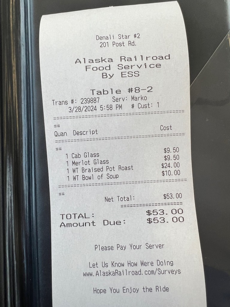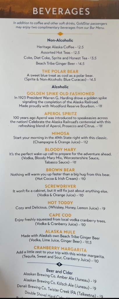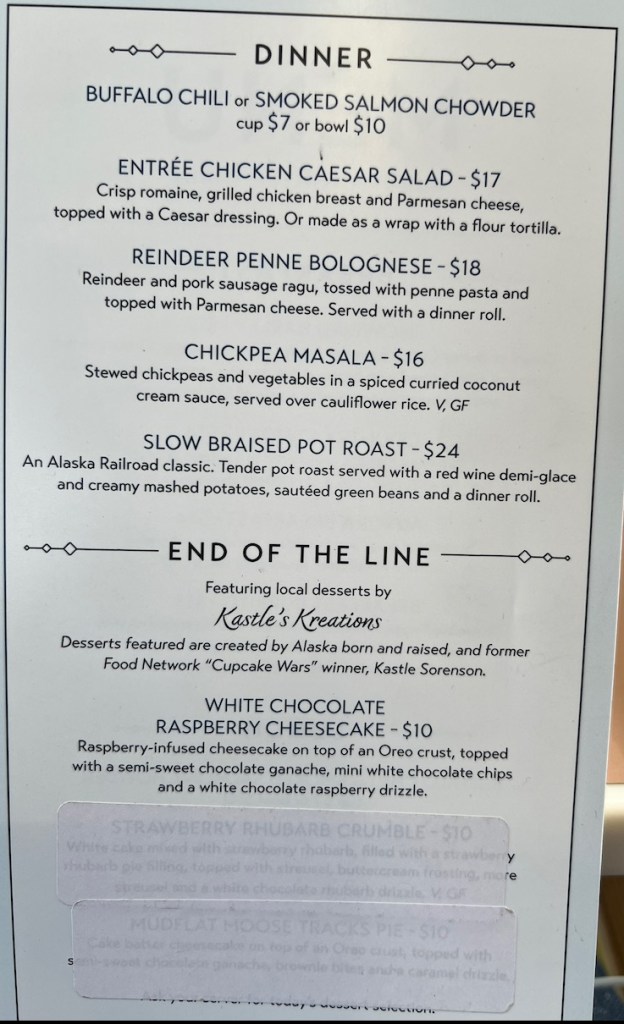 The dinner menu offered a variety of options with slow braised pork roast as being the local favorite. The Pot Roast has been an Alaska Railroad menu staple for quite some time. The dinner menu was accompanied by a bar list, offering a few cocktails and some limited wines.