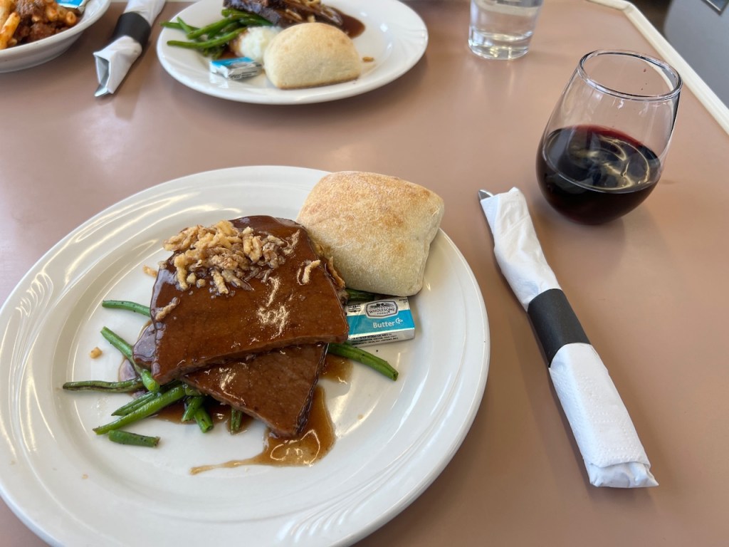 The braised pot roast was presented and was actually pretty tasty. It hit the spot after having travelled 10 hours on the train. It was paired with an unbranded Cabernet Sauvignon red wine.