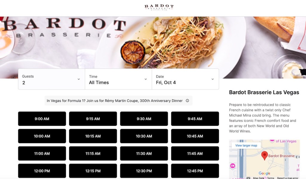 It was pretty easy to get a booking at Bardot Brasserie. After accessing the Aria Resort and Casino website, I was able to select a time using the reservations systems operated under “Seven Rooms”