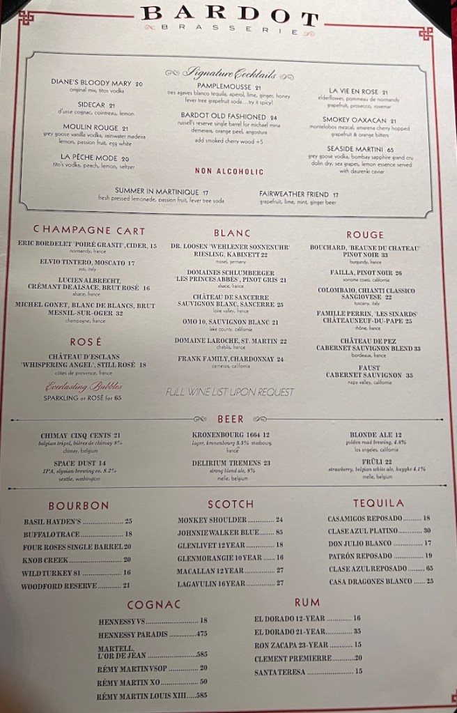 Bardot Brasserie offered a full featured drink menu. The drink menu offered a host of signature cocktails, a champagne cart, along with six white wines and six red whites from France; all of which were available by the glass.