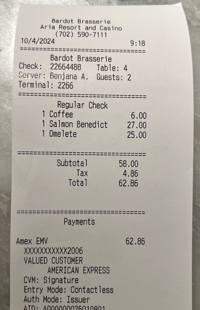 Our check came to $62 USD, with two entrées, a $6 USD drip coffee with several refills, and two complimentary glasses of sparkling wine.
