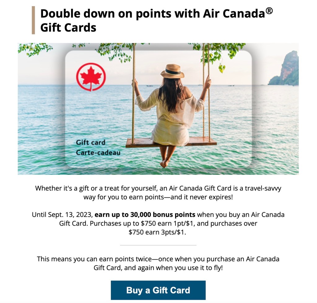 This is an offer where you can earn up to 30,000 bonus Aeroplan points when you buy an Air Canada Gift Card(s).