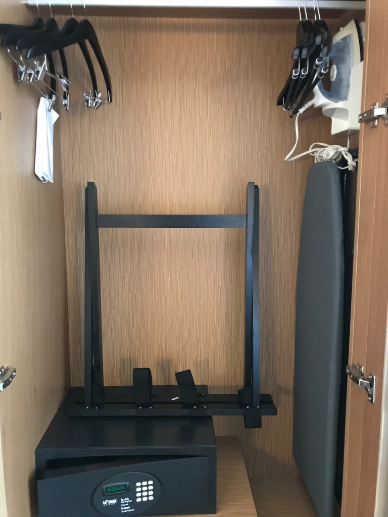 The room offered a wardrobe for clothes. It featured the usual iron, luggage rack and in room safe amenities.