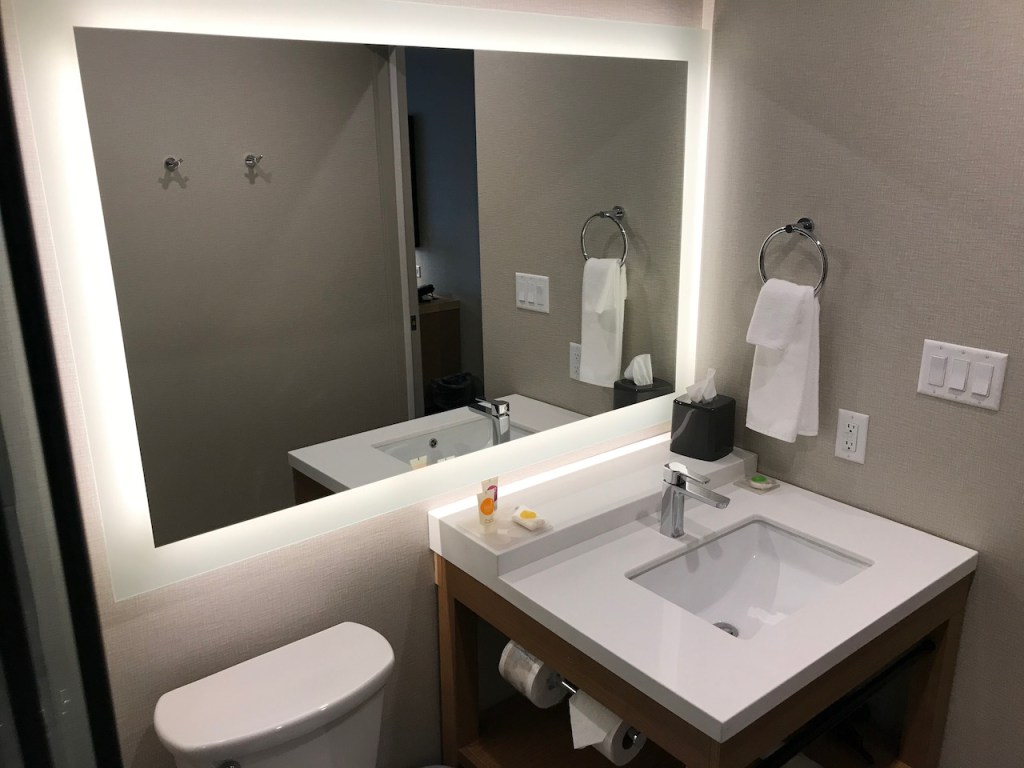 The last point about the bedroom is that I found that street noise was a little pronounced at certain times of the day, consistent with the hotel property being two major through fares and an intersection. If you happen to be a light sleeper, you may want to request a south facing room towards the rear of the property for a quieter experience.