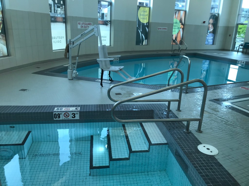 The pool was immediately situated on the ground level. Large windows would have offered a view to the street, but they were covered by marketing materials that faced outwards. The pool offered an assist lift feature, which is something that I don’t always see in hotel properties. Much like the gym, the pool was completely deserted on my stay.