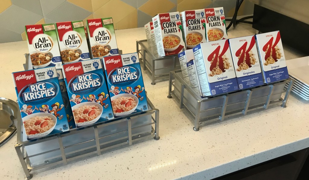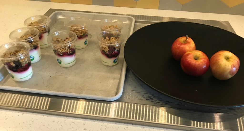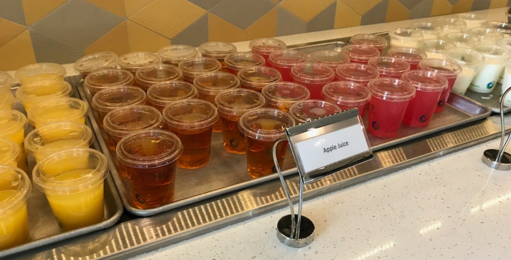 There were several breakfast items available for collection. There was a wide selection of orange, apple, and cranberry juice. There were packaged cereals and fruit and yoghurt containers with granola, which looked appealing.