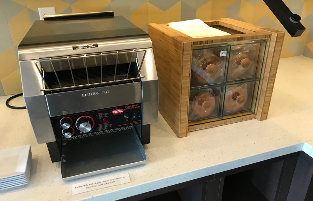 There was also a made to order breakfast available for order. Today’s feature was scrambled eggs, bacon and hash browns. Unfortunately, there was no toast available today at the self service breakfast bar, and bread was made available through bagels available at individual wrapped toaster.